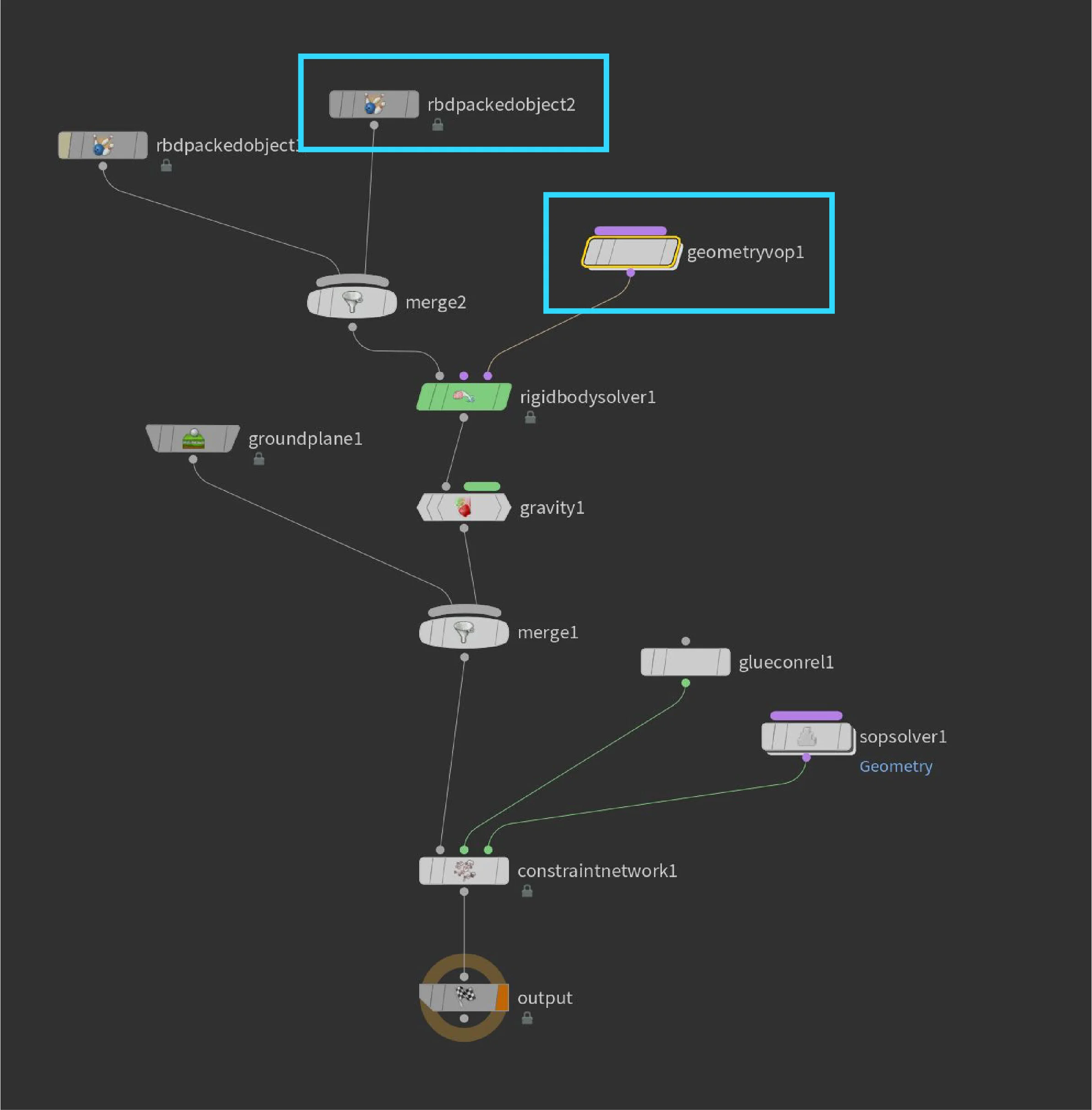 Most of the changes are made inside the geometryvop node where this will trigger the force field and decide which geometry will get which force applied to it.