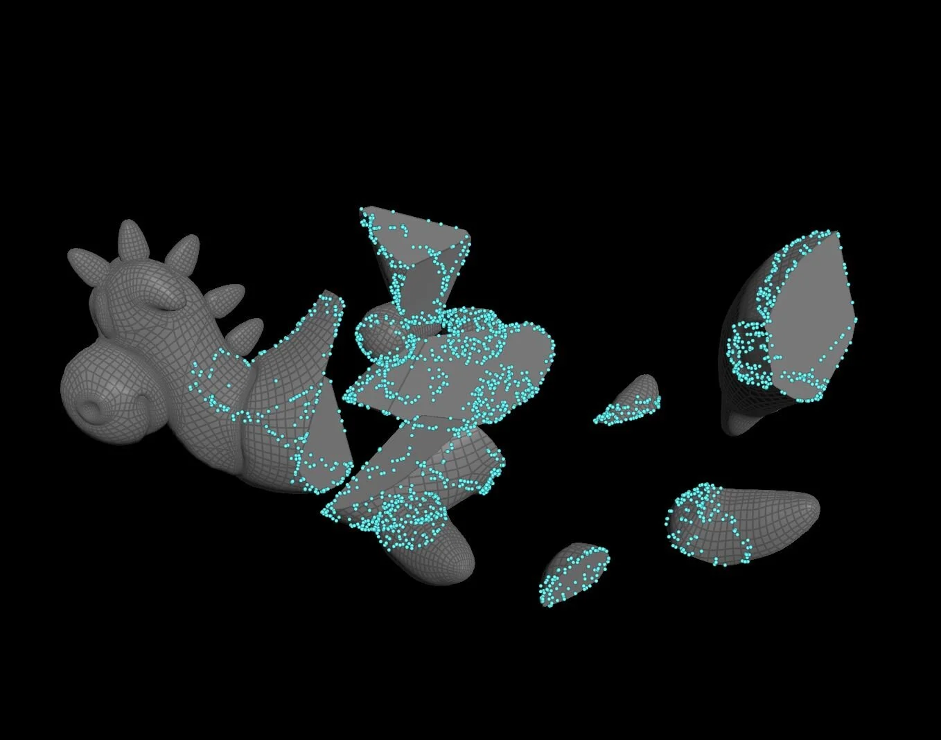 This node finds points along the edges of each fractured piece and then keeps track of a nearby point belonging to a different piece. It uses these two points to compare the distance and if this distance is greater than a set thershold distance, debri source node will consider that this fractured piece currently in collision.
