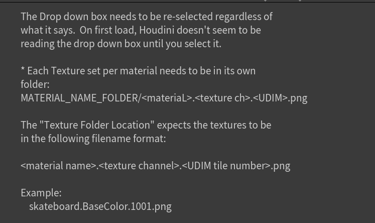My Karama Generator HDA needs a very specific folder naming convention to detect the material names. It reads the sub folder names, which is the material slots in Substance Painter. If you’re using Substance Painter to create your textures, you can use this template preset.